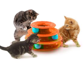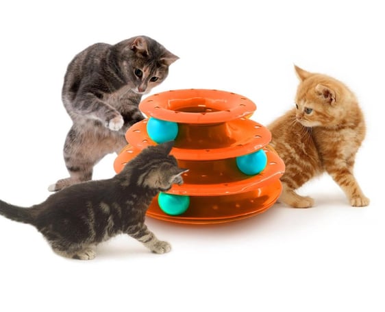 Rotating cat toy with 3 floors and 3 balls inside. 25cm diameter and 20cm height. Can be dismantled and put in a box.